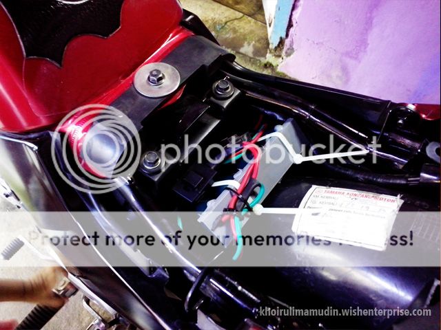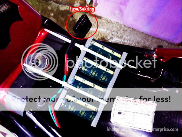Tidak lupa di jalur positif menuju aki, ditambahkan sekring. Dan kabel yang menuju ke aki menggunakan kabel yang lebih tebal. Kemudian untuk pemasangan tinggal dipasang langsung kutub (+) kapasitor ke kutub (+) aki dan begitu juga untuk kutub (-) nya. Posisi masih saya taruh di bawah jok. Ngepress banget mas bro, tapi karena ngepress ini semoga ngga goncang.